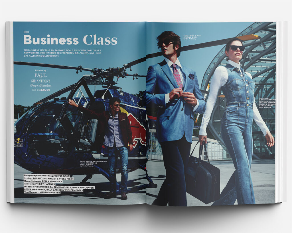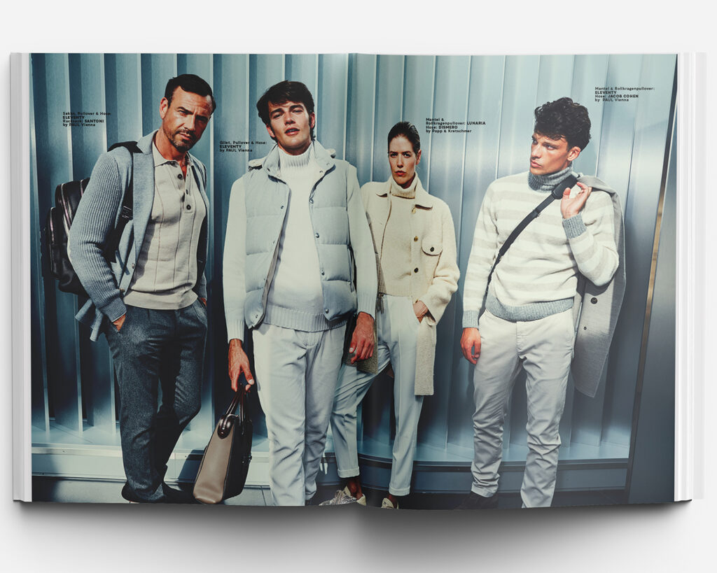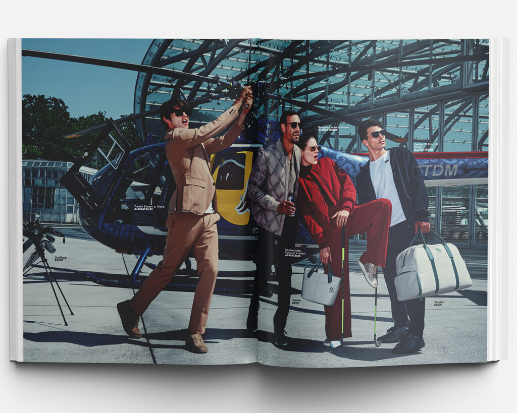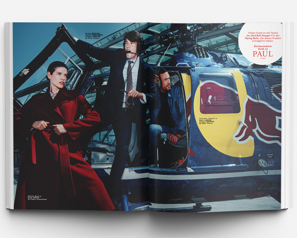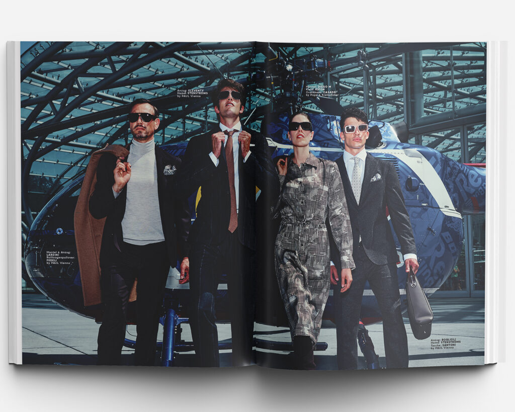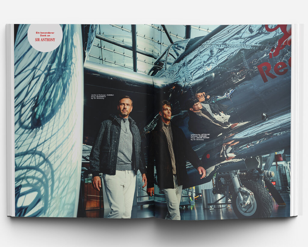 Der legendäre Red Bull Hangar-7 in Salzburg bot die perfekte Kulisse für diese Foto-Story: Offene Architektur & das mondäne Flair eines Gates am Flughafen. Maßgeschneiderte Anzüge, elegante Accessoires und jede Menge Fluggeräte.